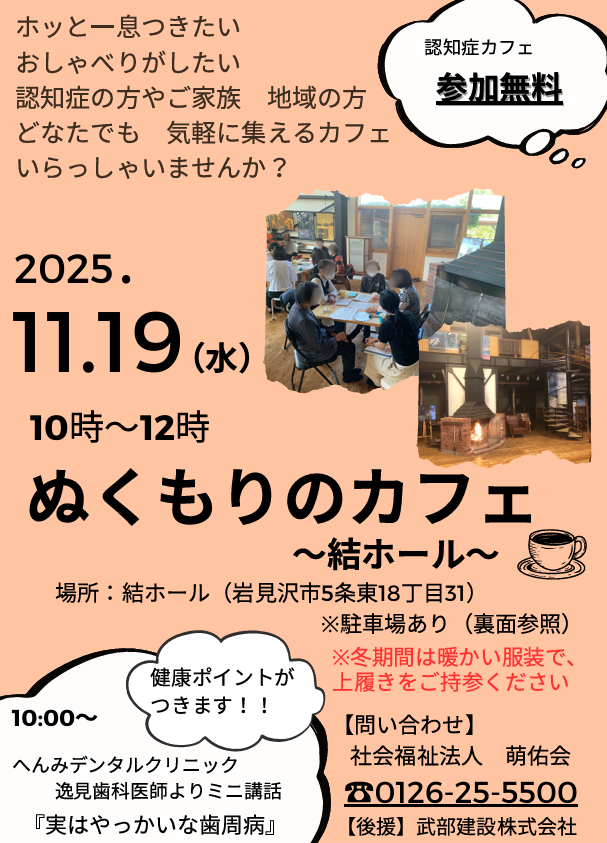 10/21(火)認知症カフェ 開催します その他 2025.10.16 こんにちは。訪問担当の小林です。 10/21(火)は認知症カフェ「歯・ハ・ハほっとカフェ」第7回目の開催です。 先月はみんなで太極拳を行いました^^ 今月も盛りだくさんの内容で開催します。 ぜひチラシをご覧ください。 11/7(金)オレンジカフェ笑顔届け隊 11/19(水)ぬくもりのカフェ こちらでもへんみデンタルクリニックが誤嚥性肺炎や歯周病のセミナーを 行います。申し込み不要です。 ダウンロード